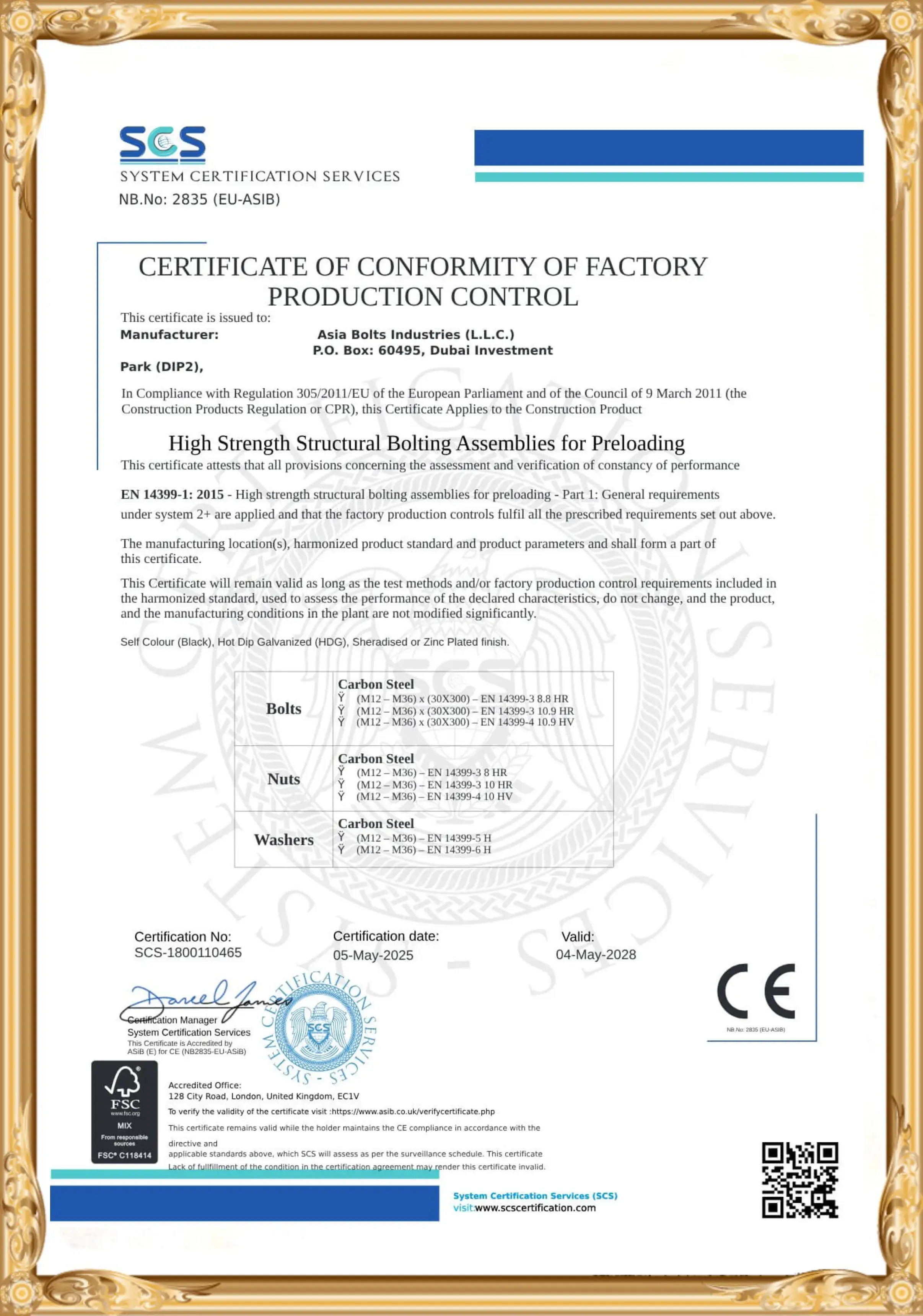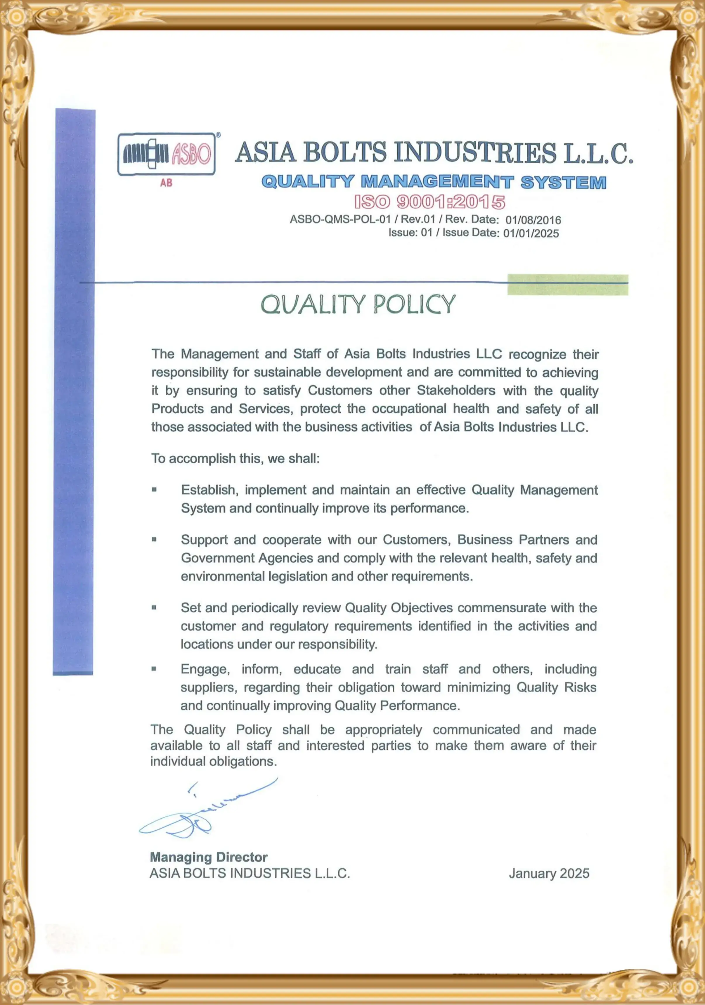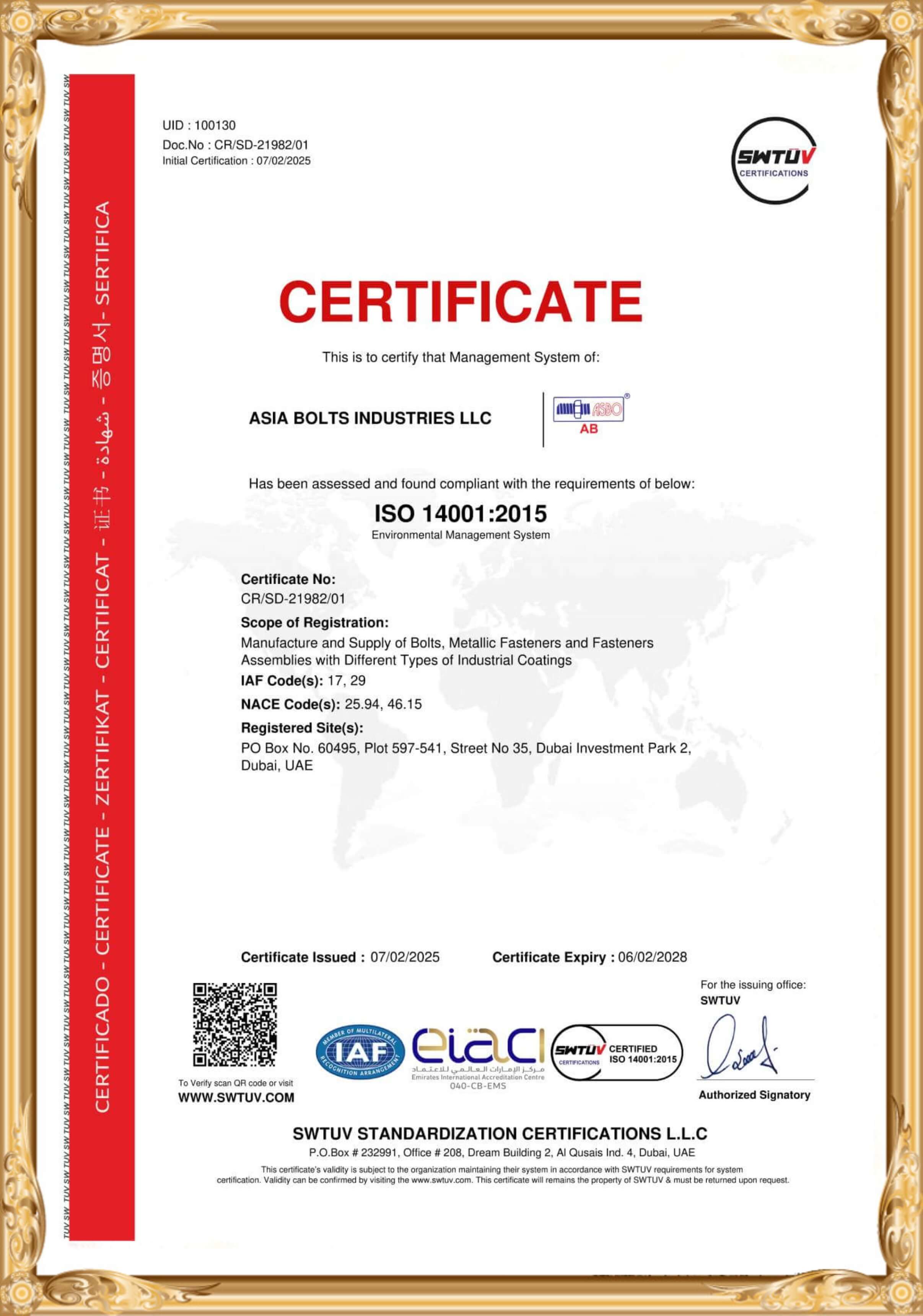 At Asia Bolts Industries LLC, we are committed to maintaining the highest standards of quality and safety in our manufacturing processes. Our certifications reflect our dedication to excellence and our compliance with international standards.